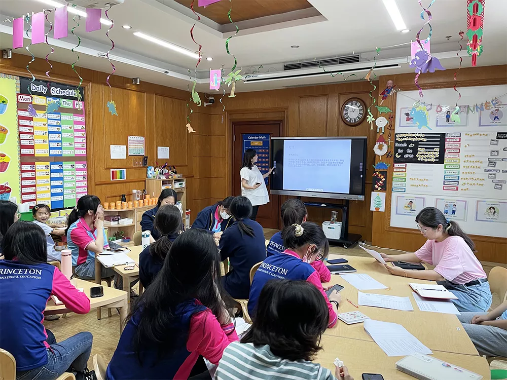 教研主任Teana为老师们提供了幼儿园中幼小衔接方面的相关培训。她与教师们探讨了剧场效应和过度刺激理论,也就是说,我们不必让孩子们过早地接收小学知识信息。